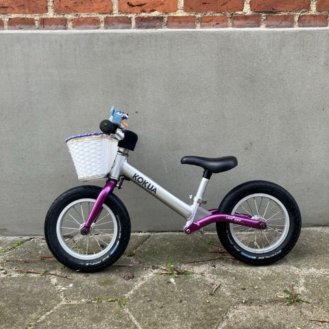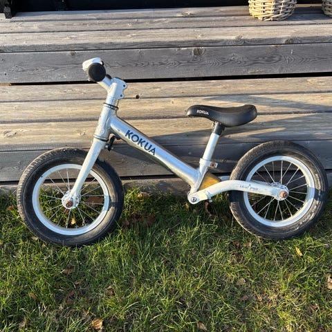 Kokua løbecykel med 12" hjul i blå og sølv. Løbecyklen har justerbart sæde, så den kan tilpasses barnets højde. Brugt af to børn, men fortsat fuld funktionel.