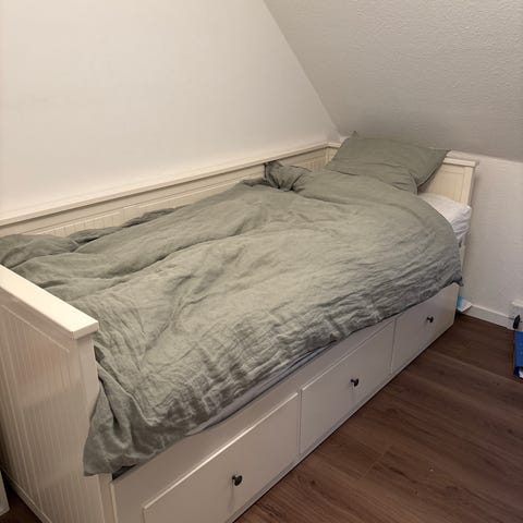 Sengen har brugsridser, og klistermærker, madras betrækket kan godt bruge en tur i vaskemaskinen 60 grader. nypris uden madrasser 2900kr, se mere på IKEA's hjemmeside.