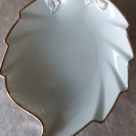 Ekstremt flot større fad i porcelæn med guldkant og guldstriber/mønster. Det er ovalt og med 6,5 cm høje kanter. Ca. 31x20 cm. Intet mærke - der står bare 60 bagpå ?