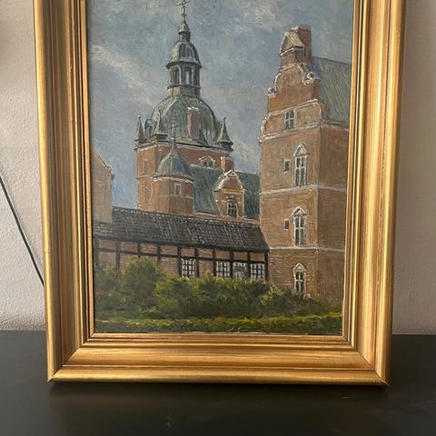 F. svendsen maleri med motiv af Rundetåen og Trinitatis kirke. Billedet er udført i farver og indrammet i en klassisk, profileret guldramme. Velegnet som vægdekoration i stue, gang eller kontor. Kunstner og præcise mål fremgår ikke af oplysningerne.