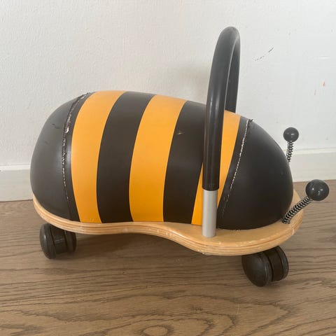 Wheely Bug bi rullelegetøj til børn. Model udformet som en bi med sort og gul overdel. Sædet er polstret og buet, og barnet kan holde fast i en bøjle i metal og plast foran. Legetøjet har fire hjul, der kan dreje frit, så det er let at køre i alle retninger. Undersiden er i træ med trykt produktinformation. Velegnet som ride- og skubbelegetøj til mindre børn, der kan sidde og skubbe sig frem på gulvet.