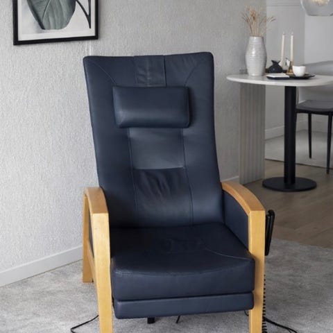 Hvilestolen er udstyret med elektrisk sædeløft og indbygget fodskammel. Stolen leveres med en behagelig nakkepude.