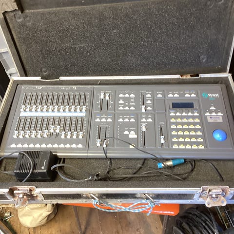 Strand Lightning mx24 lysmixer i grå farve. Enheden har flere faders og knapper til styring af lyskanaler og scener, samt display til oversigt over indstillinger. Velegnet til styring af scenelys i teater, koncert eller andre live-arrangementer, hvor der er behov for manuel og programmerbar lysstyring. Tilslutninger og betjeningselementer er placeret på top og bagpanel for nem adgang under brug.