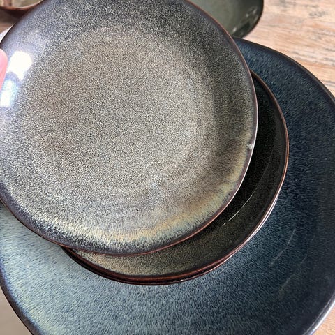Retro middagstallerkener i stentøj. 10 styk haves. Sælges som sæt som vist på billederne.