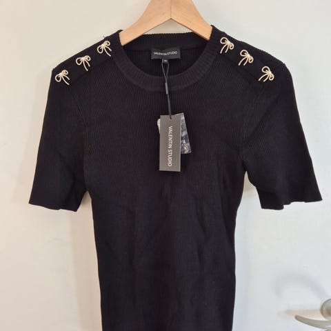 Skøn sort bluse i rib strik, med fine detaljer- guldknapper ved skuldrene og opsmøg med slidt ved ærmerne. Lækker stræk kvalitet