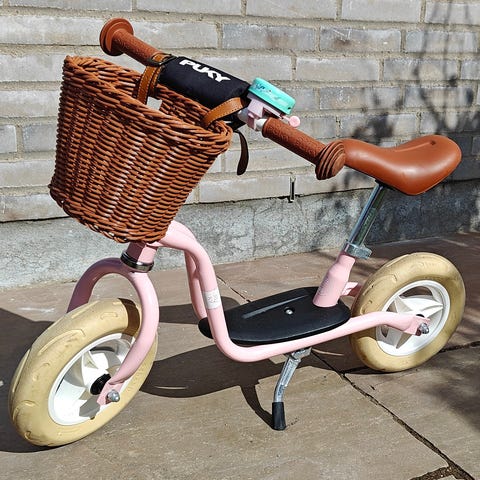 Løbecykel til børn med 10" hjul. Cyklen har grøn ramme, lyst dæk og hvid fælg. Sæde og styrgreb er i brun farve. Foran er der monteret en fletkurv på styret. Egnet som balancecykel til mindre børn, der skal øve balance og styreteknik.