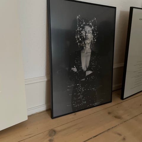 Rammen er en af de billige Ikea rammer med lidt brugsspor, så ikke den fedeste, men er mest brugt til at vide plakaten - den følger naturligvis med.