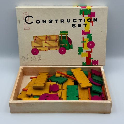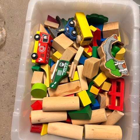 Byggesæt, Gammeldags trælegetøj, Stor kasse på hjul med mange fine velholdte træklodser. Ren 50’er-60’er nostalgi. Solidt og her er grundlag for lang tids leg og kreativitet