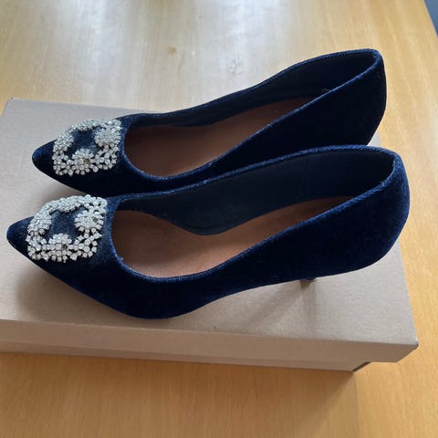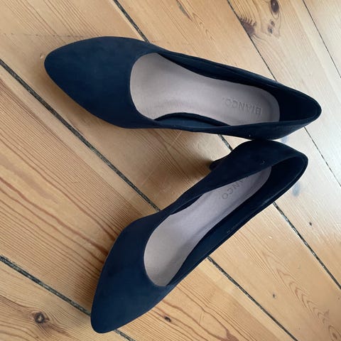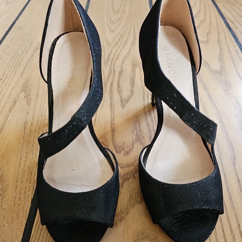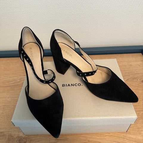 Bianco festsko i størrelse 39. Skoene er sorte med åben tå og pyntesløjfe foran, dekoreret med små sten. Overdelen fremstår i et glat tekstilmateriale, og sålen er i syntetisk materiale. Klassisk model egnet til festlige anledninger og brug sammen med kjoler eller andre pæne outfits.