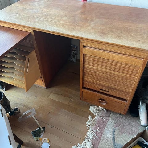 Lille skrivebord med skuffer i træ og med laminat bordplade.