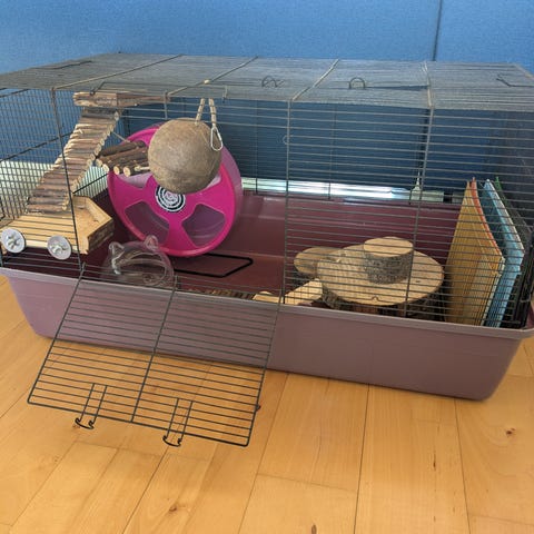 Reserveret. Glas hamsterbur, nemt at rengøre. Grisser ikke rundt om buret. Masser af tilbehør.