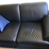 2 personers sofa. Sort læder. Uvist om det er læder på siderne.