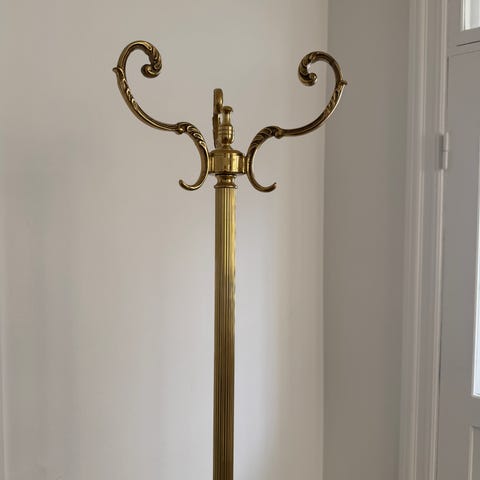 Den har en høj søjle af messing med rillet profil med hele 4 messingkroge foroven inkl. hattekroge. Toppen kan desuden rotere, så det er super let af få fat i tøjet.