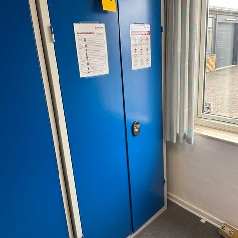 Stålskab / værkstedsskab med hylder (Uden indhold - bliver tømt inden udlevering) Måler: 100 x 45 x 200cm . Oprydning fra virksomhed