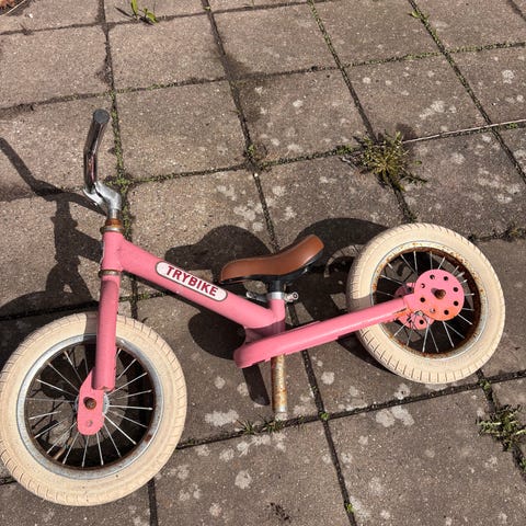 12 tommer løbecykel. Inkluderer et tredje hjul til montering af yngre børn. Inkluderer alt værktøj, instruktioner og original emballage. God stand, med mindre tegn på slid.