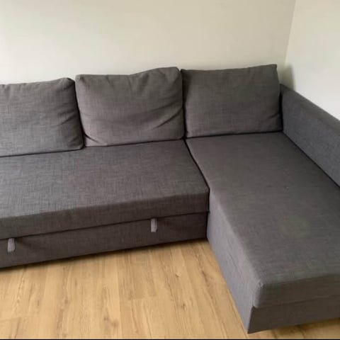 Sælger vores IKEA FRIHETEN hjørnesovesofa med opbevaring i farven Skiftebo mørkegrå.