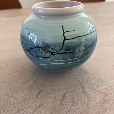 Flot glaseret fad med en diameter på 28 cm og en vase med en diameter på 15 cm