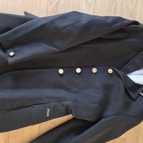 Sort ridejakke fra Horze med fløjlskrave til dame. Jakken har klassisk revers, knaplukning foran og lommer med klap. Indvendigt er den glatforet for bedre komfort. Velegnet til ridning og stævner. Foret er gået lidt i stykker på ryggen, men ikke noget der betyder noget.