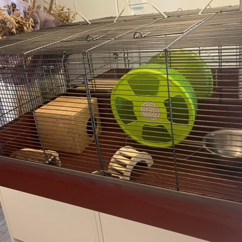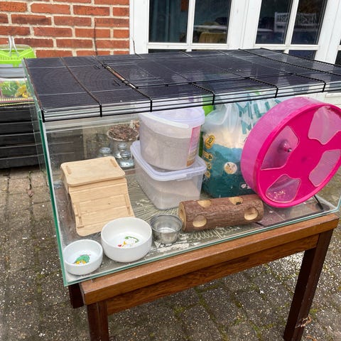 Du kan tilkøbe masser af udstyr (se foto) hamsterhjul, hus, madskål, vandflaske, vippe, hængebro, træstammer med huller, så den kan lege gemmeleg.