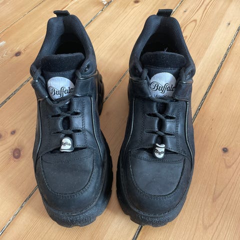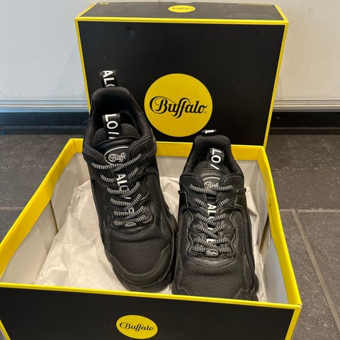 Smarte Buffalo sneakers i str. 44. Modellen er lave sneakers med kraftig sål. Skoene er sorte med blank overflade og snørelukning. Egnet som hverdagssko eller fritidssko.