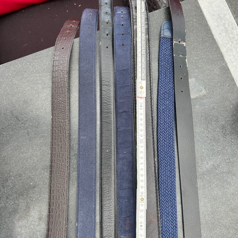 36 stk Samling af bælter til mænd i forskellige modeller og længder. Bælterne er primært i sort og brun med forskellige typer spænder, herunder klassiske metalspænder og enkelte dekorative spænder. Velegnet til brug i hverdag og til mere formelt tøj, afhængigt af det enkelte bæltes udseende. Materiale og præcise mål varierer fra bælte til bælte.