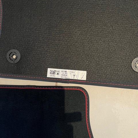 Sæt bilmåtter i sort tekstil. Måtterne har fæstne i forenden, så de kan monteres i bilens originale fastgørelsespunkter. Kantet med lys syning hele vejen rundt. Helt nye.