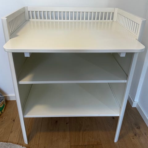Flot og funktionelt puslebord i god stand med almindelige brugsspor. Bordet har rummelige skuffer, som giver god opbevaringsplads til bleer, tøj m.m.