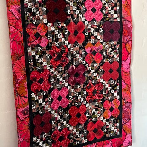 Produktet er et patchwork tæppe med farverige blomster og geometriske mønstre. Det er lavet af stof i forskellige farver. Håndværket er tydeligt, og det har en quiltet tekstur.,Bemærk at mail, chat og beskeder ikke besvares, og varen skal købes på knappen "Gå til varen"