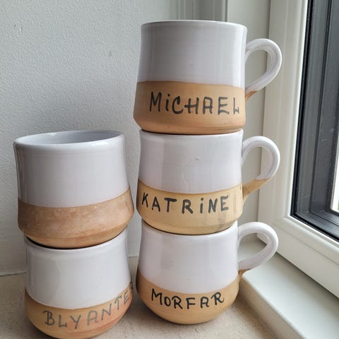 2 krus + 2 tallerkner der næsten er ens - multikunstneren JØRGEN FLEMMER fra ORØ er kunstneren til de dekorative krus & platter / tallerkner.