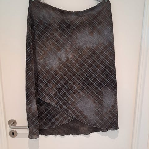 Ternet nederdel, str. 38, Vintage, God men brugt, Hjemmesyet vintage nederdel. Ternet blandingsmateriale af bomuld, uld og kunststof. Sort, hvid + røde og brune farver.