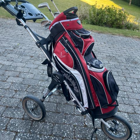 Sælger mit dame golf sæt med vogn pga. sygdom. Vognen er en Motocady M1DHC med litium batteri. 28 V .4 år gammel. Golf bag indeholder: Wilson nr 6, 7, 8 og sandjern samt fairway kølle nr. 5. Driver Cobra, Callaway nr 7, Hybrid nr 4, 5, potter. samt diverse jern.