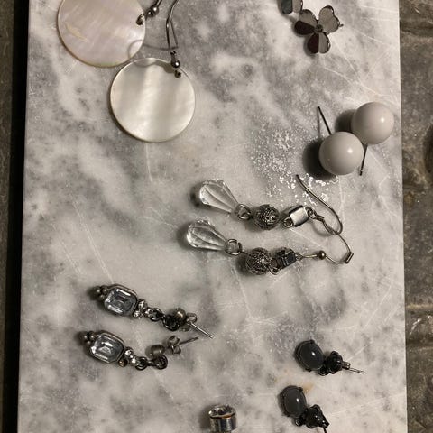 Øreringe, bijouteri, Per par 50 kroner, Kreoler i plast måner, lavet så de ligner ben - 50 kr.