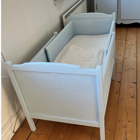 Fin hvid tremmeseng i træ, som kan følge barnet mens det vokser fra nyfødt og op.