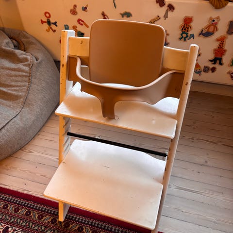 Stokke højstol i træ med polstrede puder. Højstolen har justerbar siddeplade og fodplade. Medfølgende babyindsats med sele samt hvid plastbøjle/rygstøtte til mindre børn.