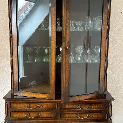Sekretærskab og vitrineskab i træ med glaslåger. Øverste del har to buede glaslåger med sprosser og hylder til opbevaring eller udstilling. Midterste del består af en klap, der kan slås ned og bruges som skriveplade, med små skuffer og rum indvendigt til organisering af papirer og småting. Nederste del har flere store skuffer med metalgreb til ekstra opbevaring. Skabet egner sig til brug som skrive- og opbevaringsmøbel i stue, kontor eller spisestue.