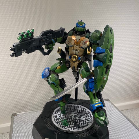 Teenage Mutant Ninja Turtles Rapheal Mech figur i flerfarvet plast. Figuren står på en rund base med TMNT-logo og har flere mekaniske detaljer som kløer, bor og raketdyser. Velegnet som samlerfigur eller udstillingsmodel. Figuren fremstår som en større model, egnet til hylde- eller vitrineskabudstilling.