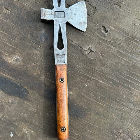 Økse, bredbiløkse. Øksehovedet er intakt, med god æg. nem at slibe og få skarp. Skæftet er er helt på nær lille afslag, som kan ses på foto. Ingen borehuller eller revner. Holdbart en god tid endnu.