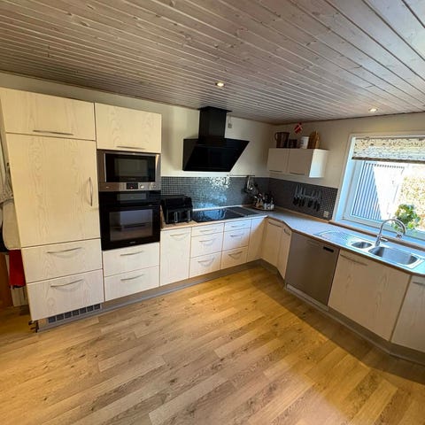 Køkkenet har meget god opbevaringsplads. Den ene side består udelukkende af høje skuffer (2 skuffer i hvert skab). Den anden side består af et vaskeskab, to skuffeskabe med 3 skuffer til bestik m.m., plads til integreret opvaskemaskine af mærket Fisher & Paykel (medfølger ikke) samt et skab med et lille køleskab (medfølger ikke). Skabet kan eventuelt ombygges til et almindeligt hyldeskab i stedet for det lille køleskab.