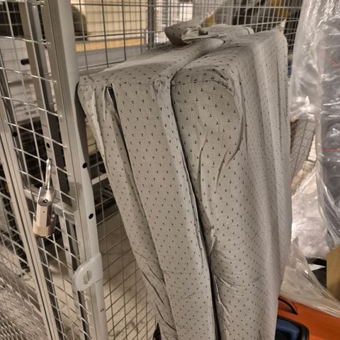 Jysk gæstemadras / foldemadras med blomstret og stribet betræk i rosa og grønne nuancer. Madrassen består af tre sammenklappelige sektioner, så den kan bruges både som liggeflade og som lav stol/rygstøtte på gulvet. Betrækket har lynlås, så det kan tages af. Velegnet som ekstra soveplads eller til afslapning på gulvet.