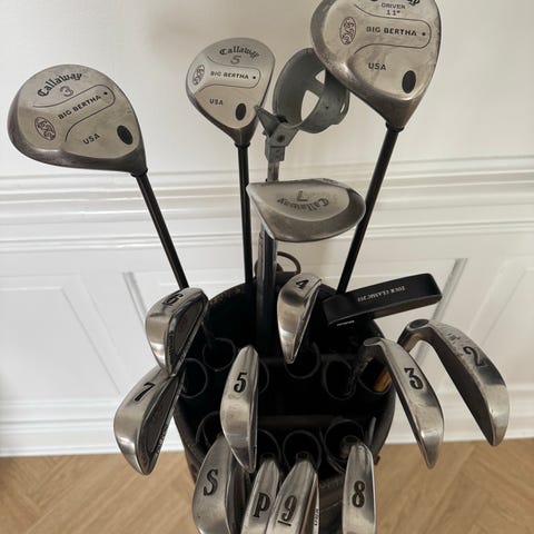 Callaway golfsæt med Fusion FT-3 Driver og X22 jern med Graphitskafter. Grips er gode. Kommer med golfvogn. Giv et bud på det komplette sæt. Til herrer højrehånd højde 175-185 cm.