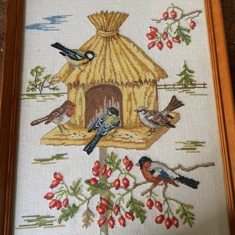 Samling af diverse broderier og vægophæng med forskellige motiver. På billedet ses blandt andet aflange broderier, runde broderier i rammer samt et ovalt broderi. Motiverne omfatter fugle, natur, blomster, huse og figurmotiv. Egnede som vægpynt eller dekoration i hjemmet, eksempelvis i stue, gang eller køkken. Sælges samlet som på billedet.