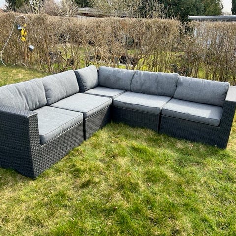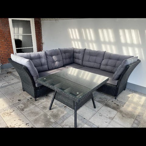 Stort loungesæt med vaskbare hynder. Hynderne er fine, men som billedet viser, er de en smule solramte. Det har kun kosmetisk betydning.
