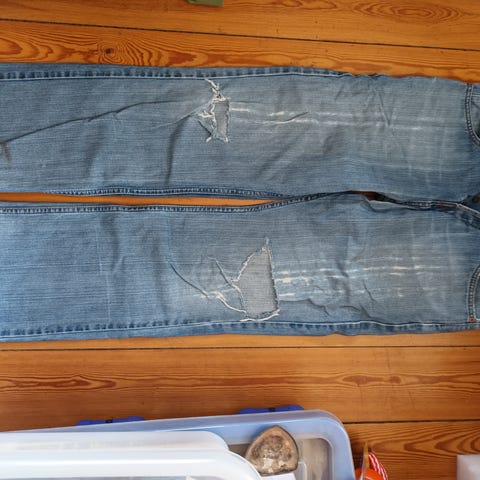 De er brugte men ikke ret meget, de er købt med slidt look, der er slidt hul over knæet.