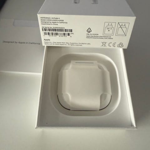 Apple AirPods 4 trådløst headset i hvid. Headsettet leveres med trådløst opladningsetui, som beskytter og oplader ørepropperne. AirPods forbindes trådløst til kompatible Apple-enheder via Bluetooth og kan bruges til musik, opkald og anden lydafspilning. Designet som in-ear øretelefoner med integrerede mikrofoner og touch-betjening på selve ørepropperne.