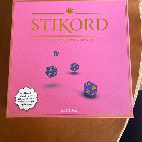 Stikord brætspil. Spillet er et ord- og gættespil for flere spillere, hvor deltagerne bruger stikord til at få deres hold til at gætte de rigtige ord. Sættet indeholder spilleplade, kort i forskellige kategorier, terninger, timeglas, spillebrikker og blok til notater. Velegnet som selskabsspil for familier og grupper.