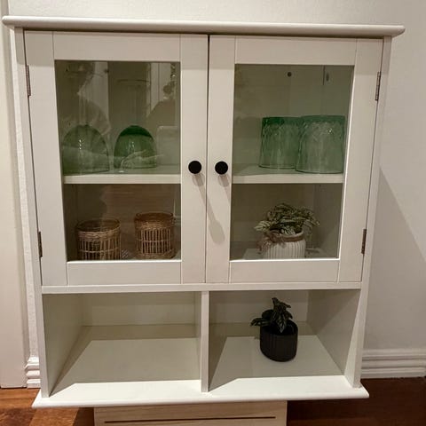 Lille vitrineskab til ophæng på væg. Er i fin stand. Enkelte små ridser på toppen, i hjørner og kanter.