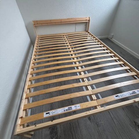 Ikea Neiden sengestell og lameller. Er allerede taget fra hinanden, så det er derfor der er der billeder fra Ikea. Kun brugt i nogle måneder, så næsten nyt.