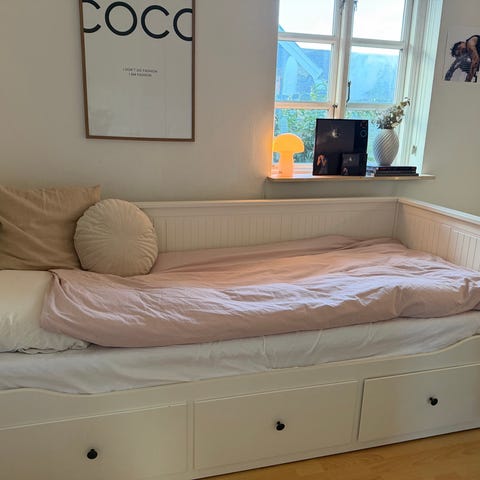 IKEA seng med skuffer i sort. Sengen har integreret opbevaring i form af skuffer under liggefladen, som kan bruges til opbevaring af sengetøj, tøj eller andre genstande. Velegnet som enkeltseng i soveværelse, gæsteværelse eller børneværelse og kan trækkes ud.