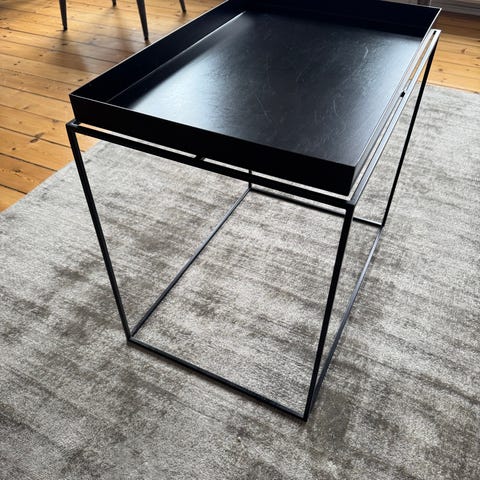 Rundt sidebord i sort metal med trebenet stel. Bordet har en rund bordplade med opkant og et centralt håndtag, som gør det nemt at flytte. Egnet som lille sofabord, sengebord eller afsætningsbord i stue, soveværelse eller entré.