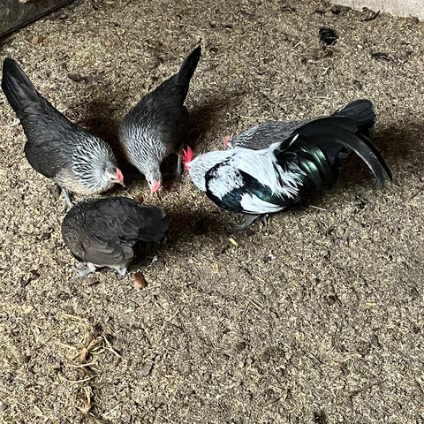 Hane og 3 høns fra 2025 racerene og i æggelægning , æggene vejer 25-30 gram. Meget lille dværgrace . Kontakt 21463052
